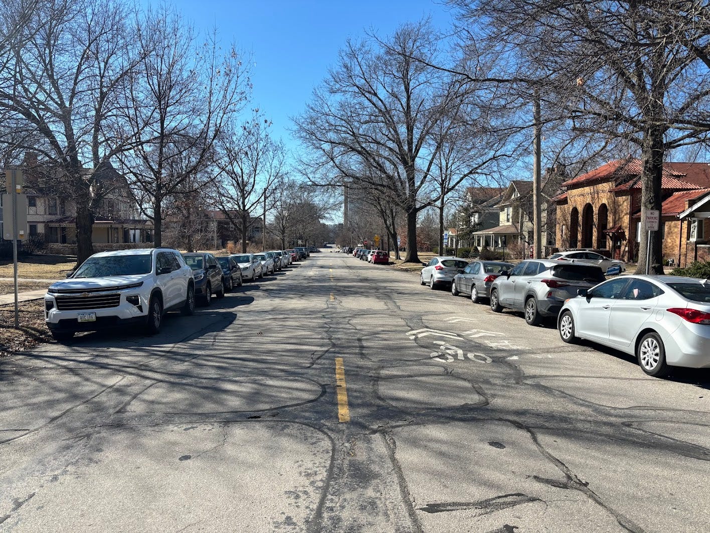 Now, do I know that the marks on the asphalt are where the track itself used to run? No, I don’t. It sure seems that way to me, but what gives streetcar streets like this away is the width. Rundell is the widest street in that neighborhood by far, and it’s very noticeable. (From what I can find, the streetcar started at about where Sheridan Avenue is today and then ran down Rundell, left onto Muscatine, and then left again onto Burlington.)