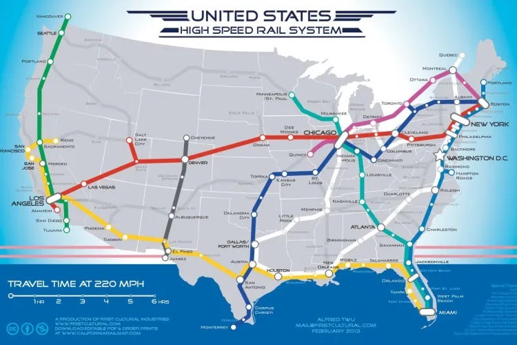 When Abundance hit the bookshelves last year, it sparked an immediate policy-wonk debate in Democratic circles, but the underlying points of the book (and others like it) remain hard to refute: why can’t we build anything anymore? Plenty of people dream about things like high-speed trains. This map pops up on the internet now and again, like a Gen Z rail aficionado’s dream: